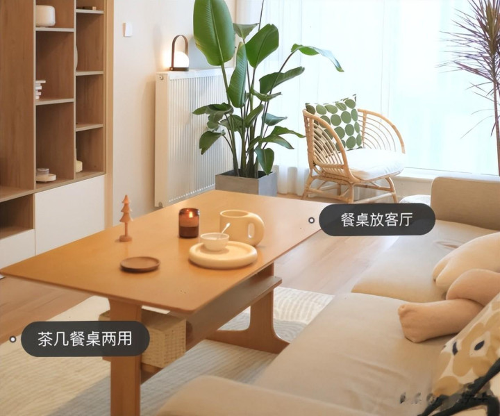 可年轻人都觉得本来小户型的客厅就很小,放上大型的茶几显着很突兀,还很杂乱,直接就用餐桌去代替茶几,实用性很强。