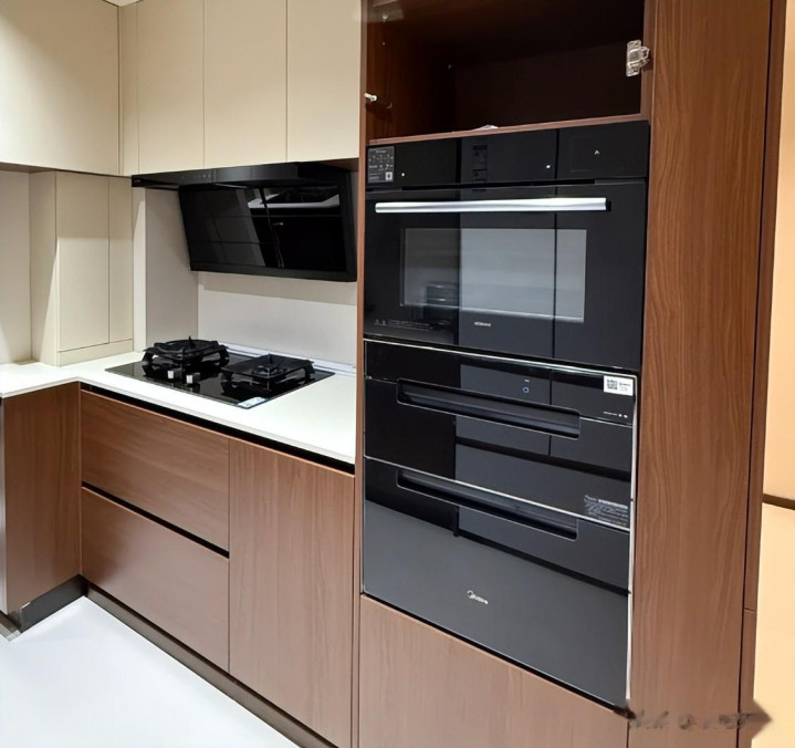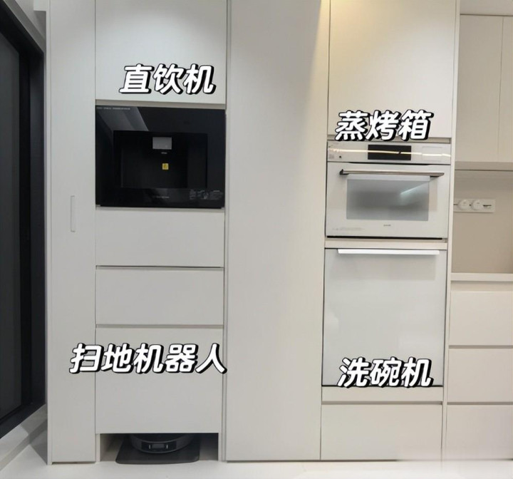 家里采用这样的设计后,能让电器跟柜子严丝合缝,不会产生卫生死角,