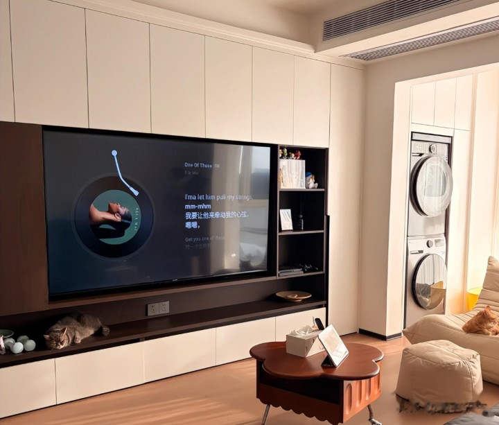 电视墙去做满墙的收纳柜,收纳空间大了,家里的杂物也有位置放,简直不要太爽。
